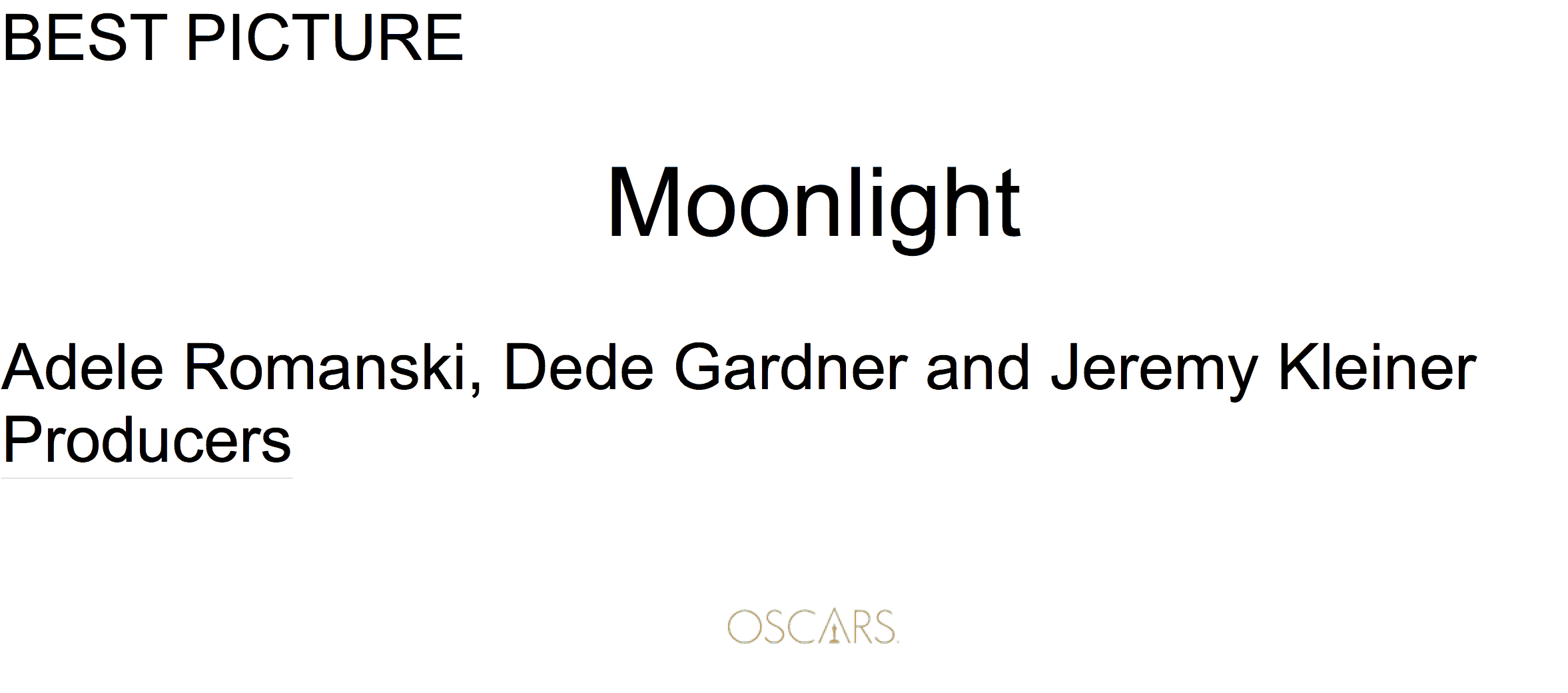 Using a simple San Serif Font – large print for the award category and the name of the winner followed by the people involved with the Oscars logo at the bottom.
